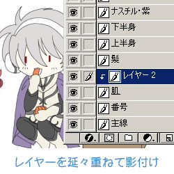 「乗算」と言うのを選んで、影にしたい部分をこのレイヤーに塗って行きます。